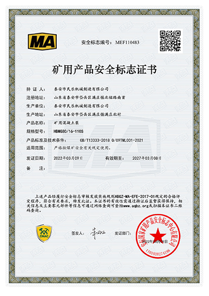 熱烈慶祝我廠礦用混凝土輸送泵通過煤安安全標志證書(煤安編號:MEF110483、MEF110484、MEF110485)。目前公司成功研制出HBMD15/6-22S混凝土輸送泵、以下簡稱“15立方混凝土泵”,且在銷售市場俏銷的形勢下乘勝前進,又試機成功**款新型的高壓大輸送量混凝土輸送泵HBMD30/13-90S混凝土輸送泵、HBMD80/16-110S混凝土輸送泵,目前已成功申辦“煤安標志”,把產品推向市場。