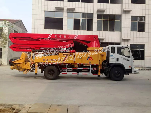 混凝土泵車是利用壓力將混凝土沿管道連續輸送的機械。由泵體和輸送管組成。按結構形式分為活塞式、擠壓式、水壓隔膜式。泵體裝在汽車底盤上,再裝備可伸縮或屈折的布料桿,就組成泵車。混凝土泵車的動力通過動力分動箱將發動機的動力傳送給液壓泵組或者后橋,液壓泵推動活塞帶動混凝土泵工作。然后利用泵車上的布料桿和輸送管,將混凝土輸送到一定的高度和距離。